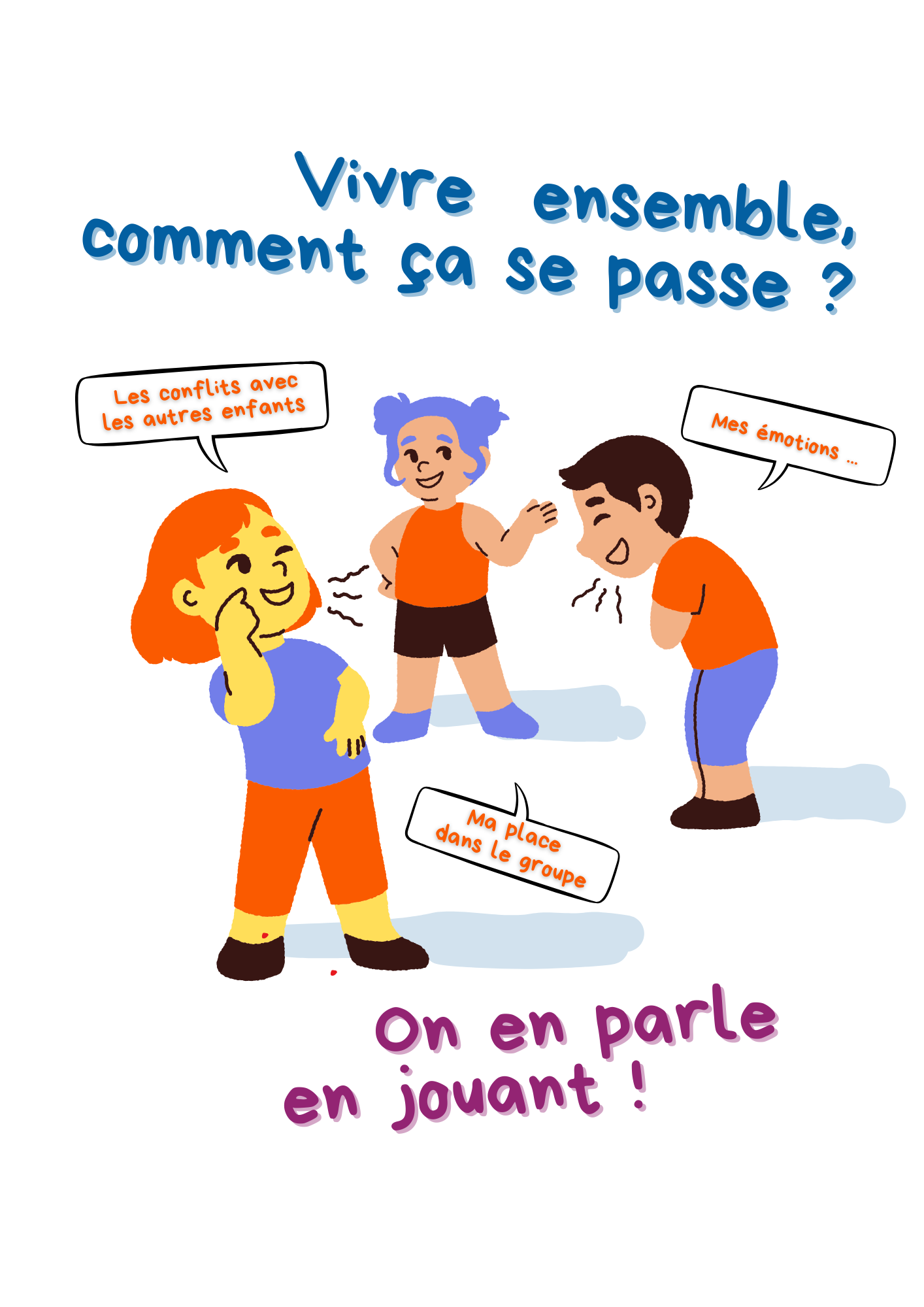 "Vivre ensemble, comment ça se passe ? - Questionnement sur le rapport de l'adulte à l'enfant - Les conflits avec les autres enfants - Mes émotions - Ma place dans le groupe" --> On en parle en jouant !